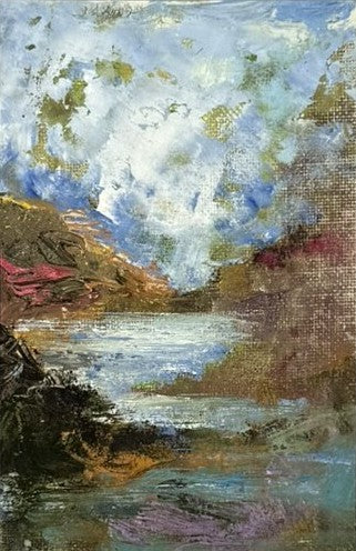 Abstract Landscape. Painted on Canvas Board. Title: March Wind. Measurements: Canvas Size: 6" High x 4" Long. Matt Size: 8" x 10". Option for Frame is available. Please contact me. Location: Hudson River Valley, Up State New York. Spring 2025