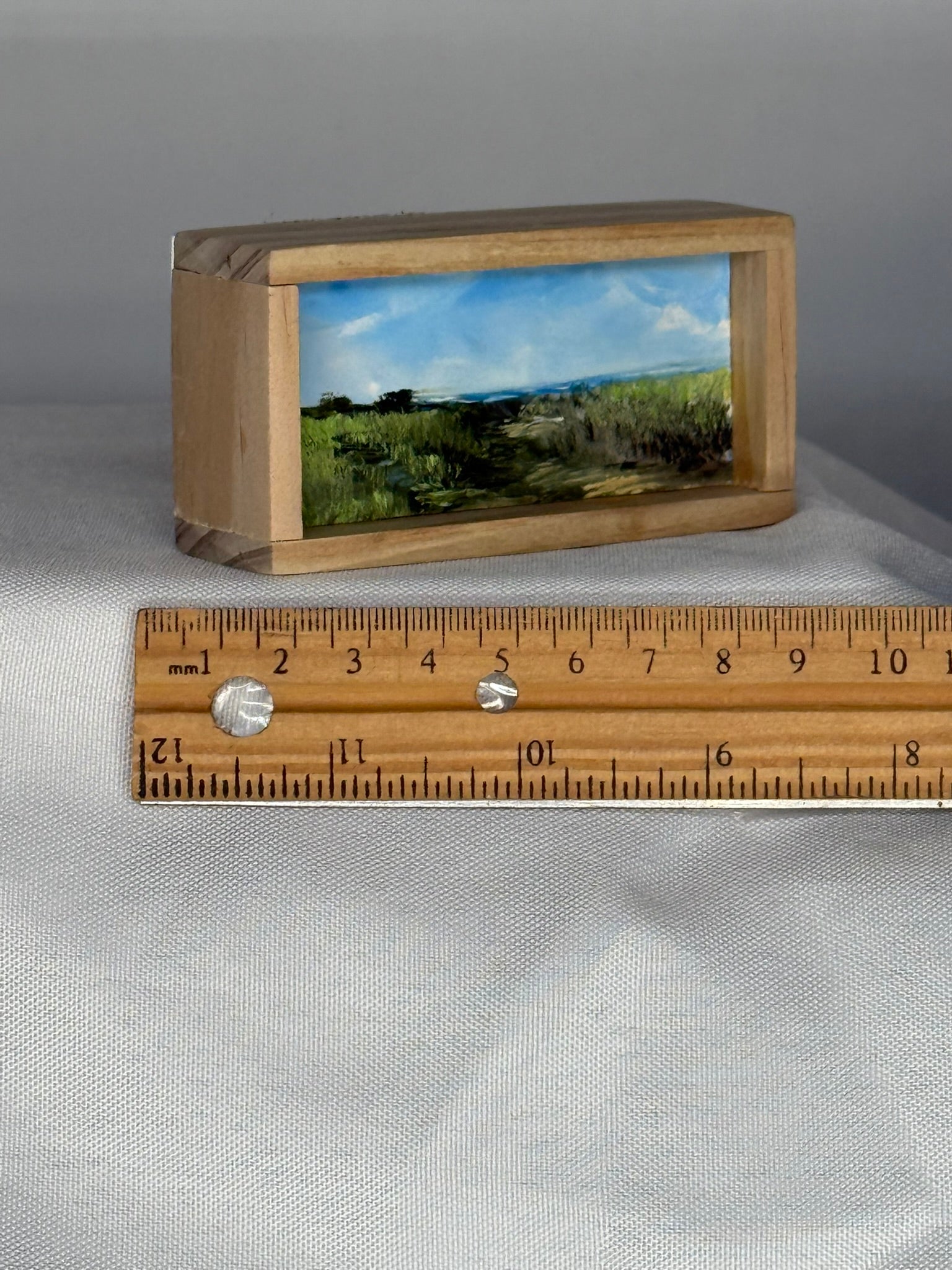 Mini Wood Block Painting #1. Oil on reclaimed wood. Framed in recycled framing material. Sizes range from 2” to 4” with and over all height of 1”. If there is a specific location you would like, please feel free to email me and I can show what I have.