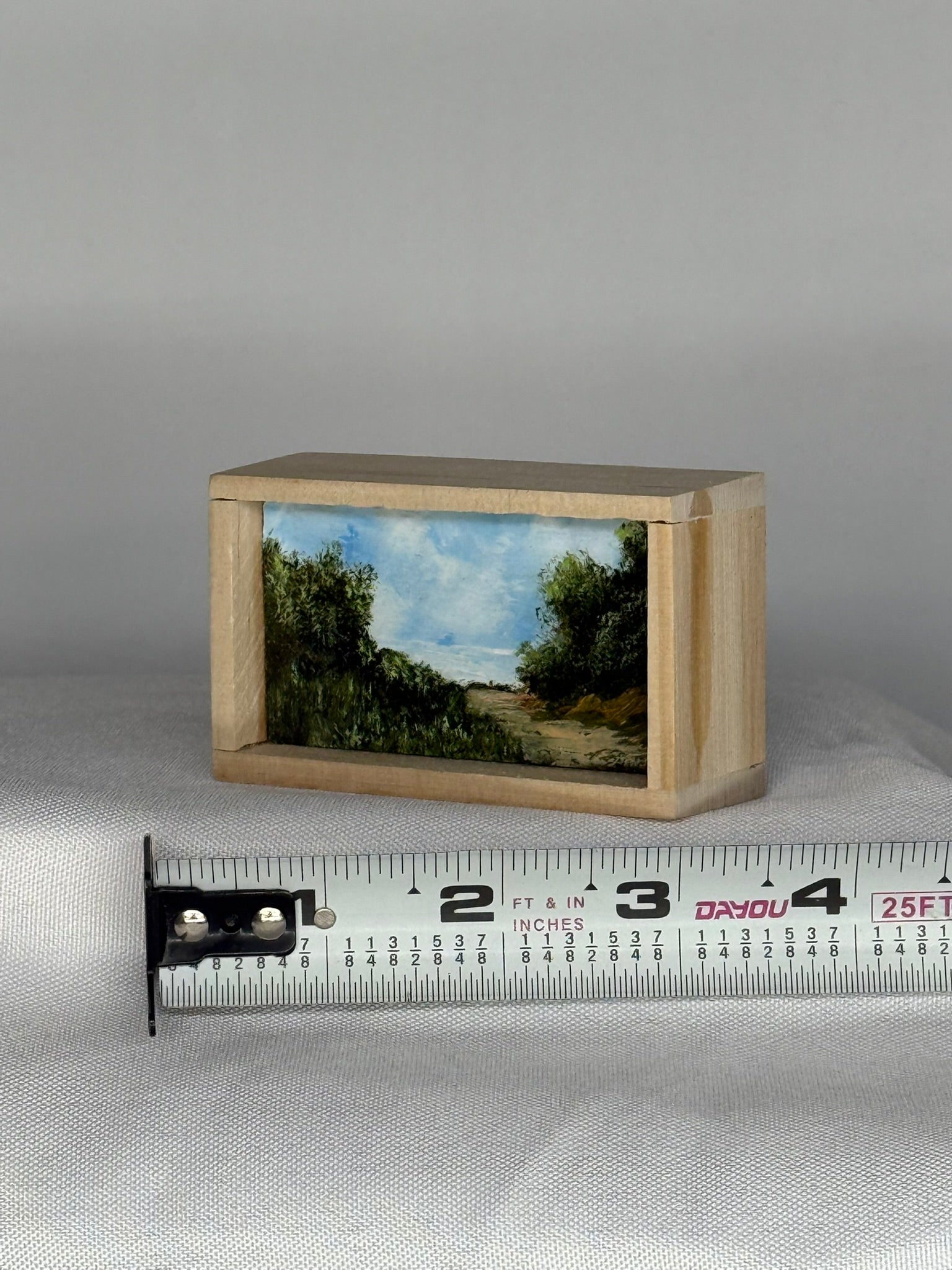 Mini Wood Block Painting #24. Oil on reclaimed wood. Framed in recycled framing material. Sizes range from 2” to 4” with and over all height of 1”. If there is a specific location you would like, please feel free to email me and I can show what I have.