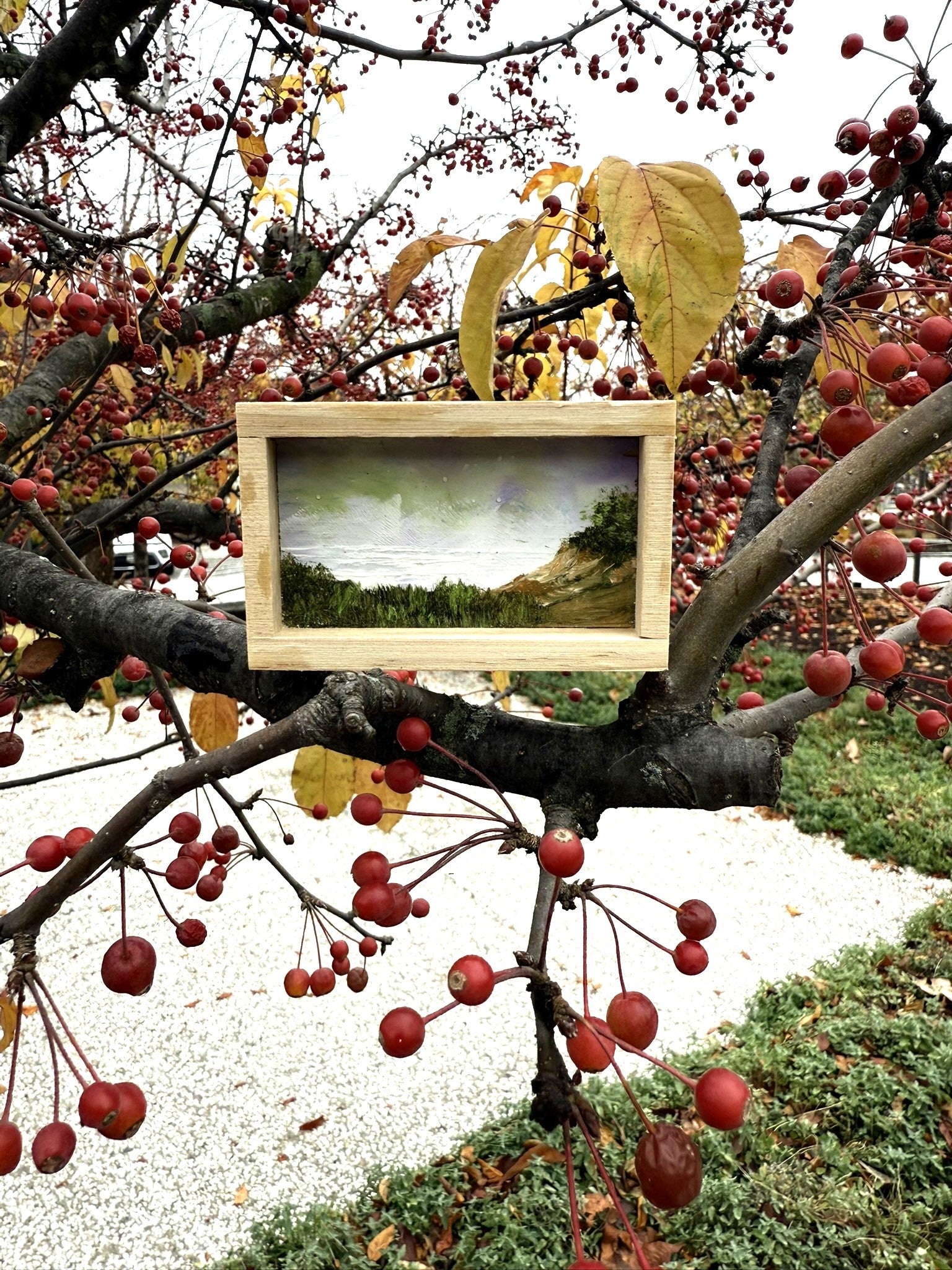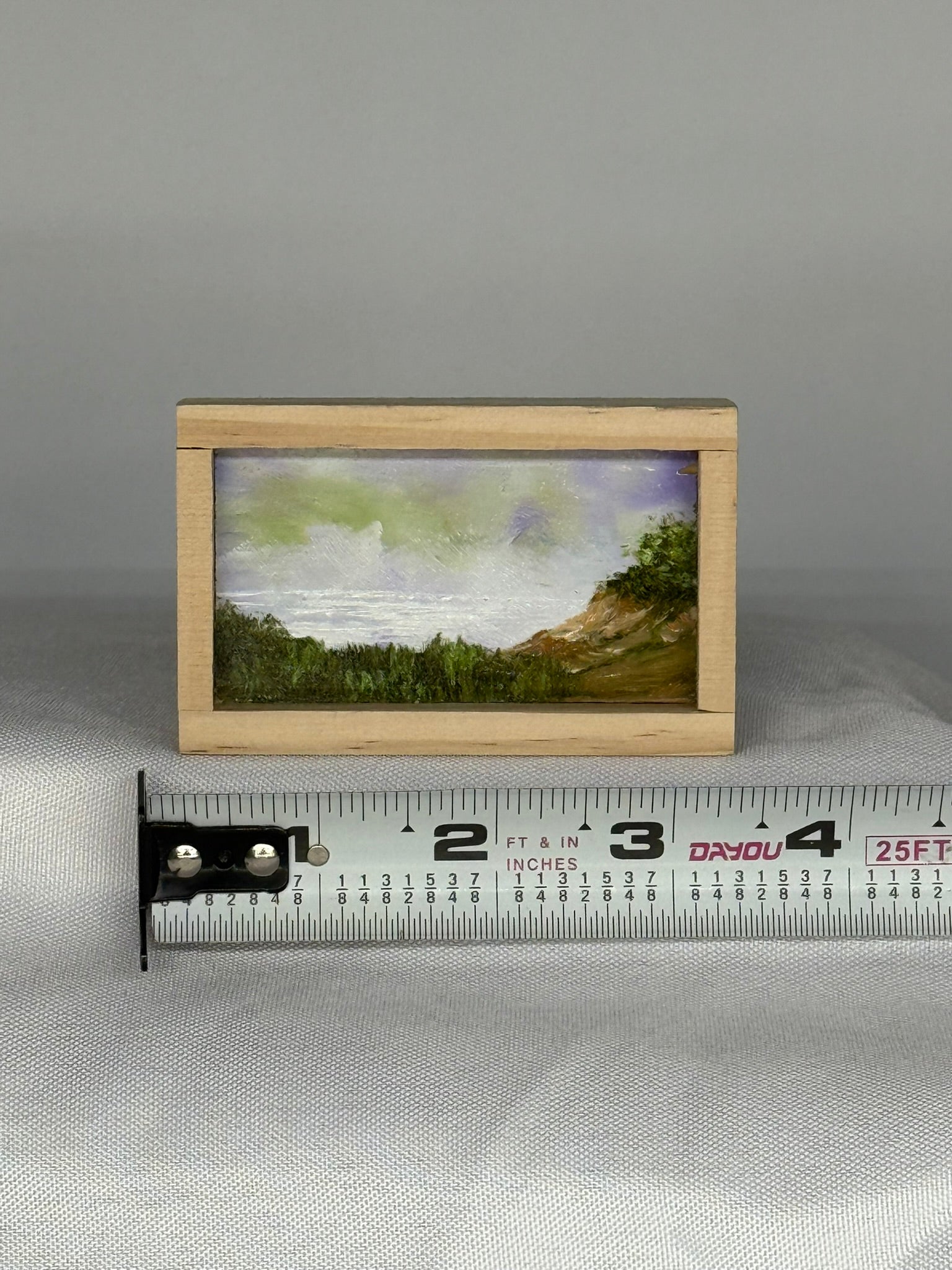 Mini Wood Block Painting #26. Oil on reclaimed wood. Framed in recycled framing material. Sizes range from 2” to 4” with and over all height of 1”. If there is a specific location you would like, please feel free to email me and I can show what I have.