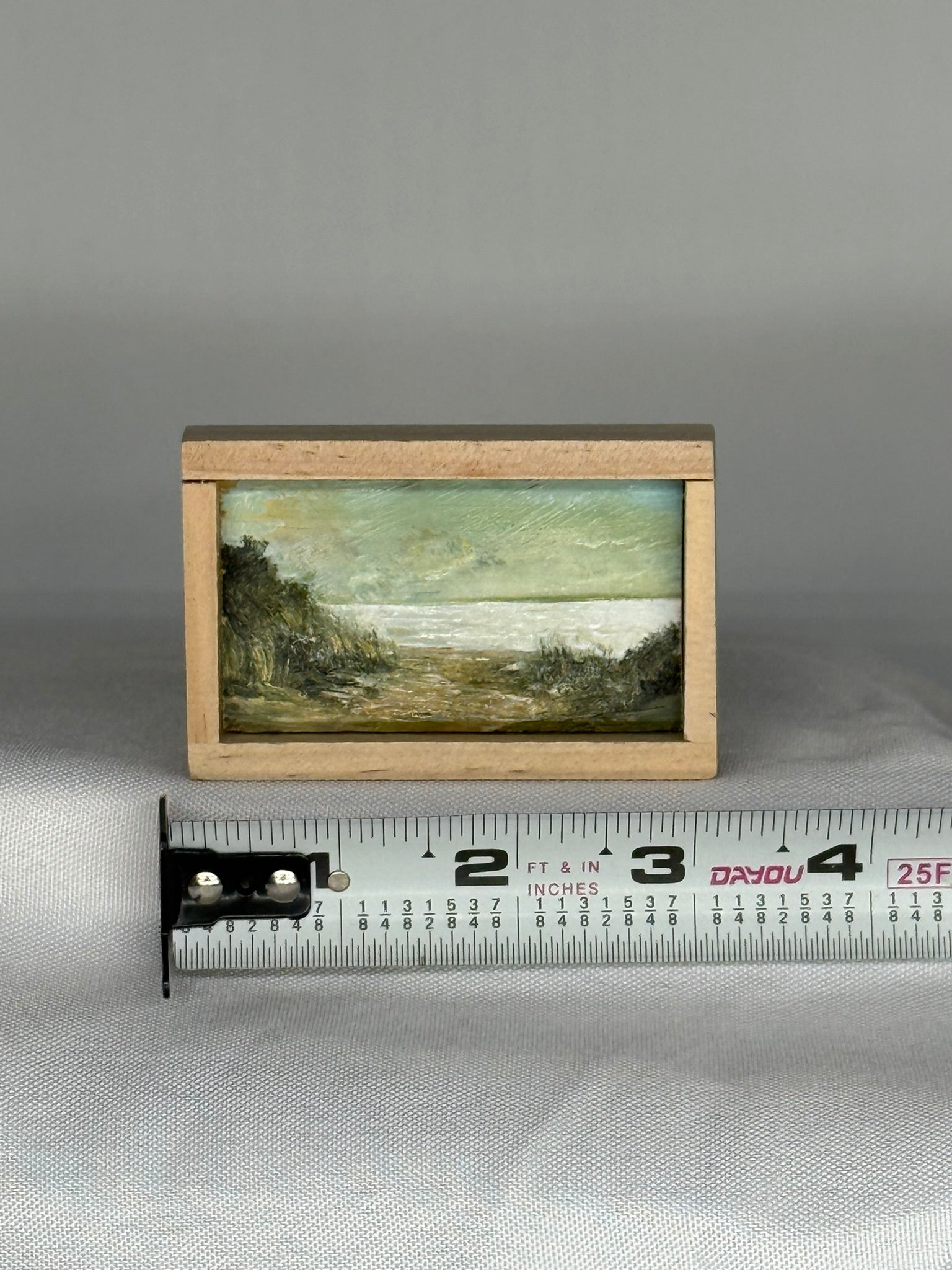 Mini Wood Block Painting #32. Oil on reclaimed wood. Framed in recycled framing material. Sizes range from 2” to 4” with and over all height of 1”. If there is a specific location you would like, please feel free to email me and I can show what I have.