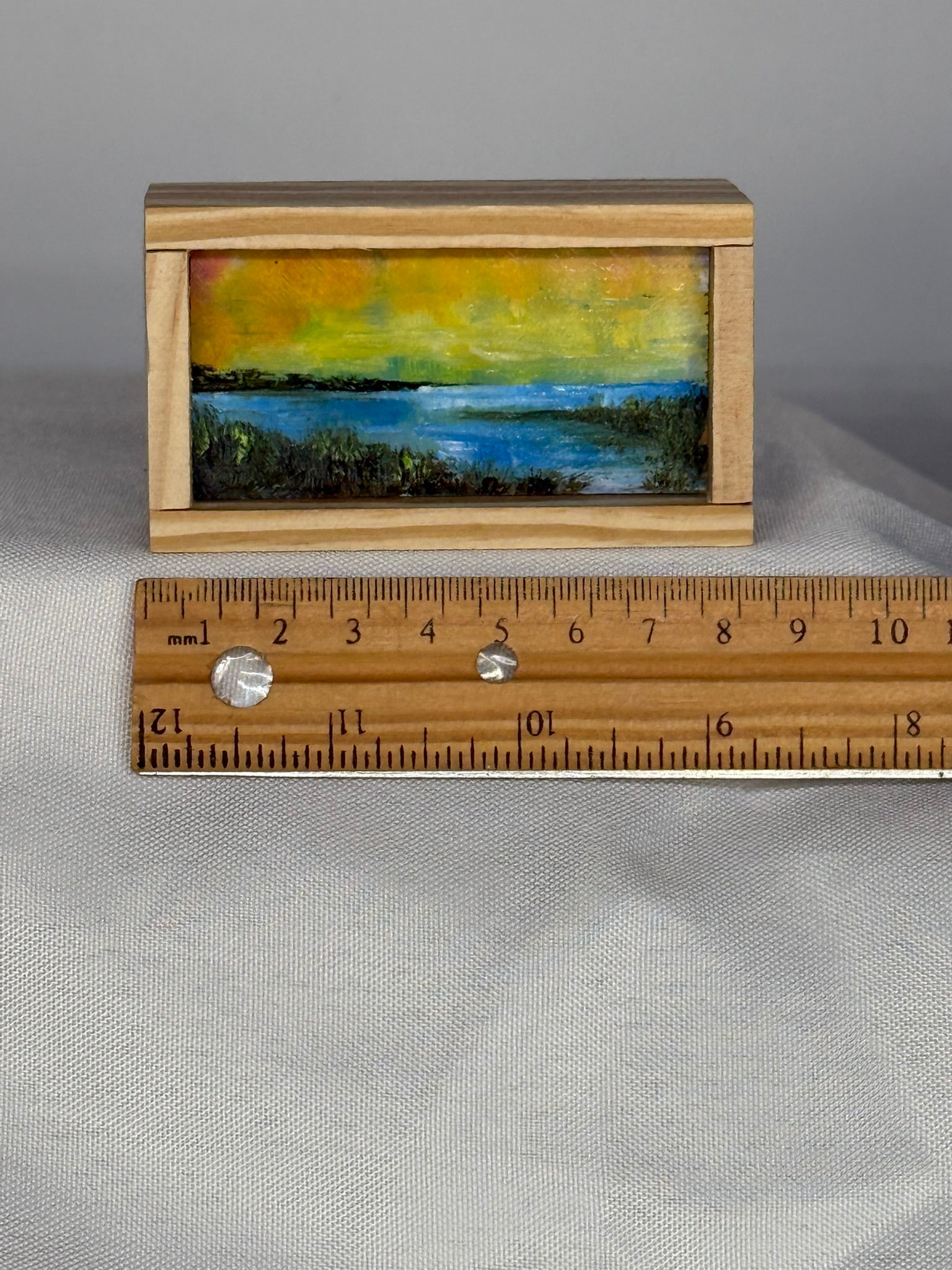 Mini Wood Block Painting #34. Oil on reclaimed wood. Framed in recycled framing material. Sizes range from 2” to 4” with and over all height of 1”. If there is a specific location you would like, please feel free to email me and I can show what I have.