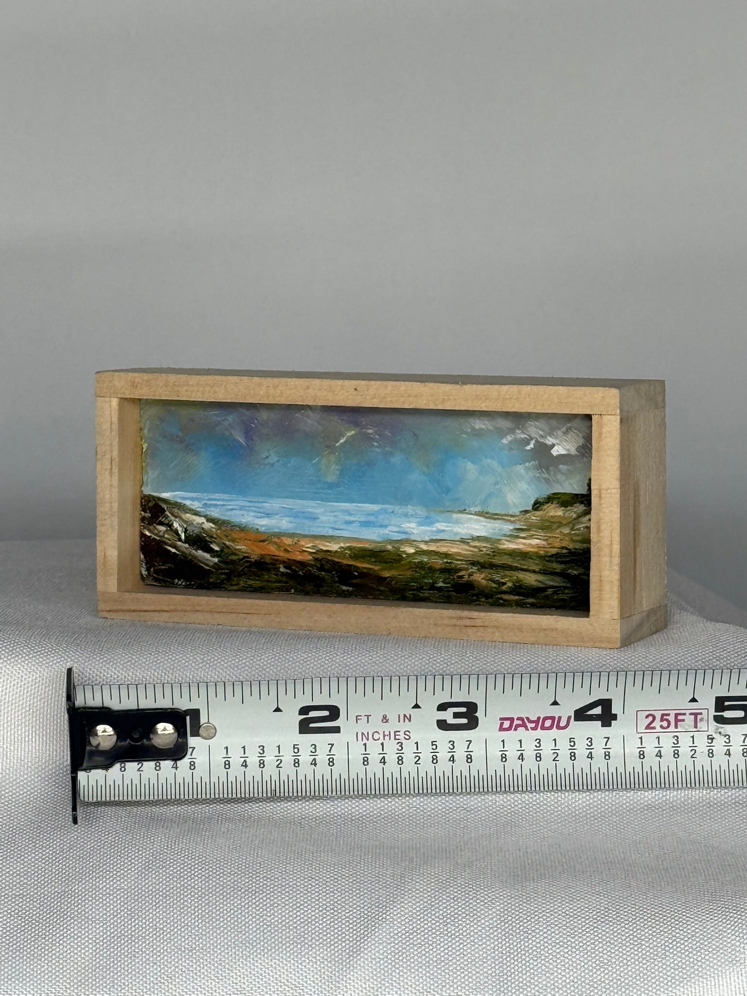 Mini Wood Block Painting #45. Oil on reclaimed wood. Framed in recycled framing material. Sizes range from 4” to 8” with and over all height of 1”. If there is a specific location you would like, please feel free to email me and I can show what I have.