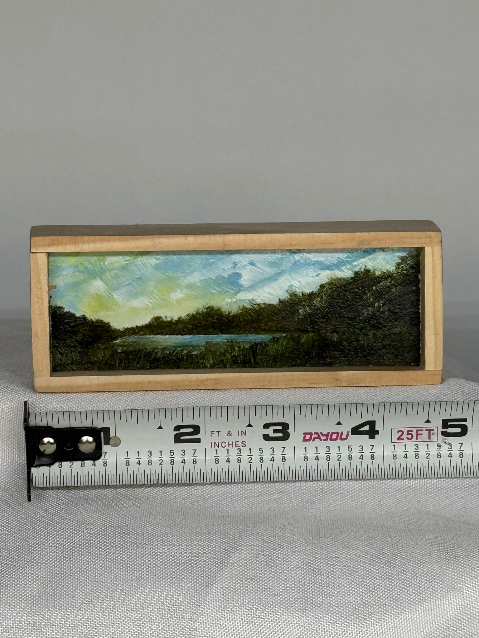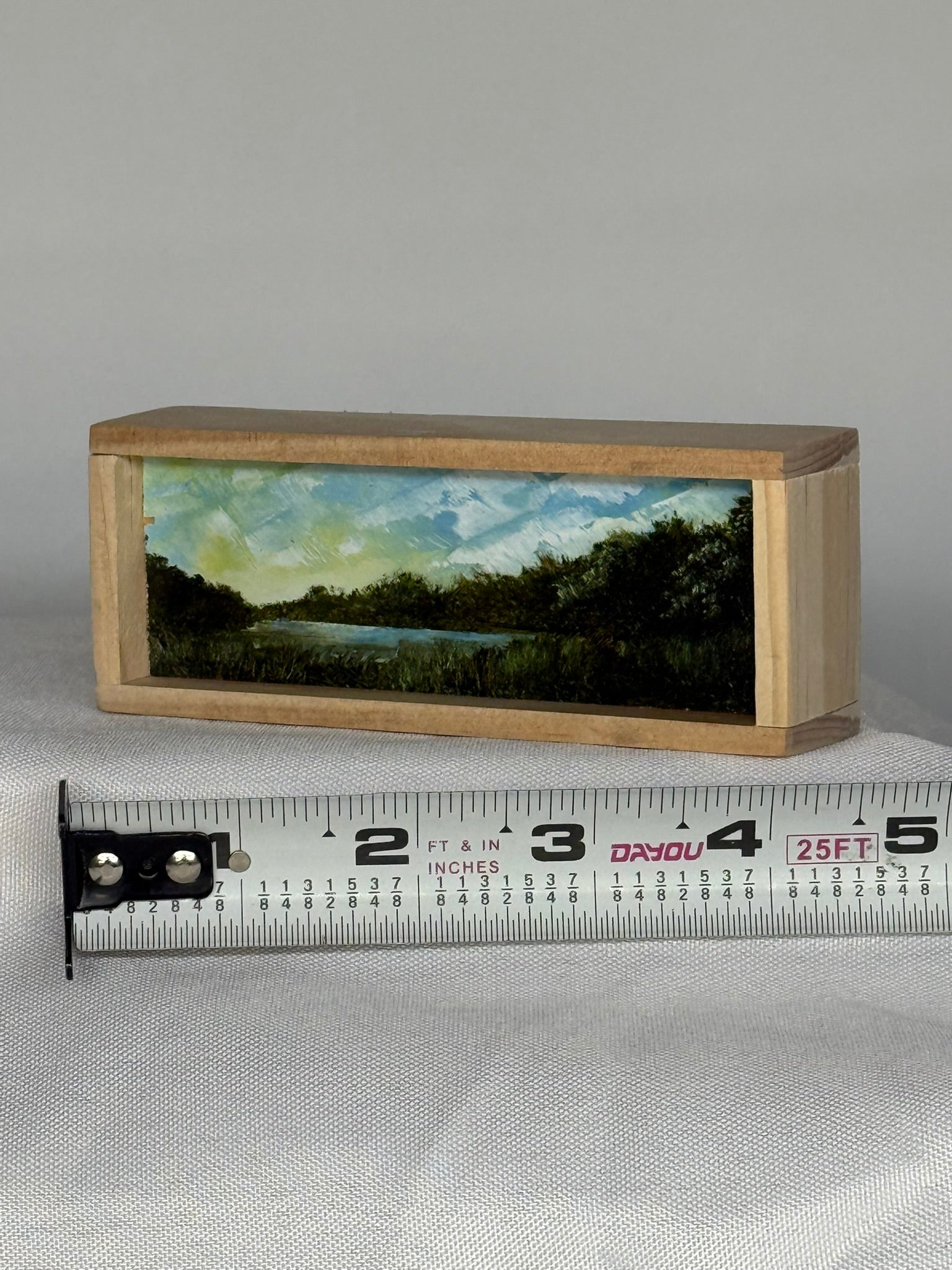 Mini Wood Block Painting #47. Oil on reclaimed wood. Framed in recycled framing material. Sizes range from 4” to 8” with and over all height of 1”. If there is a specific location you would like, please feel free to email me and I can show what I have.