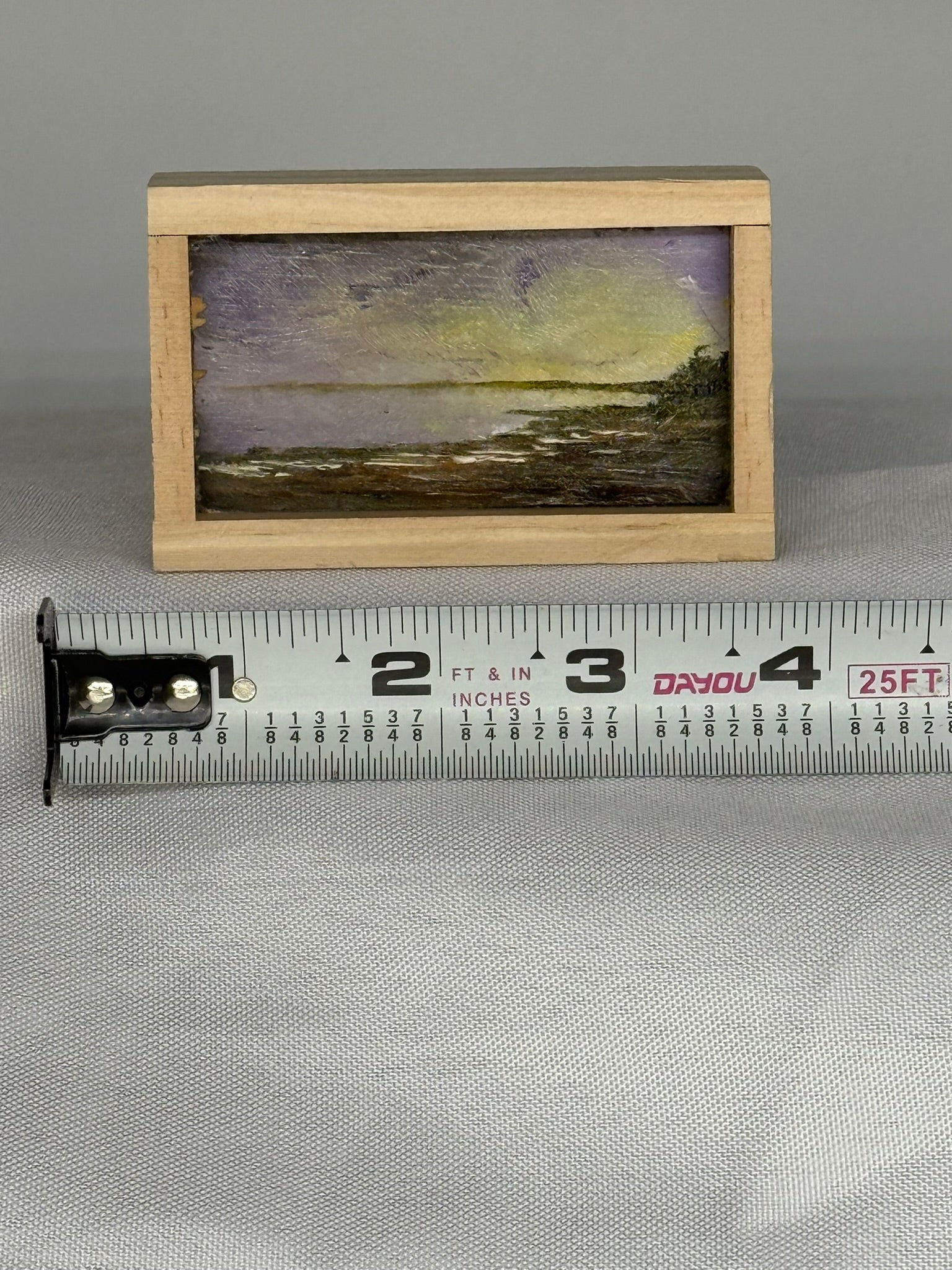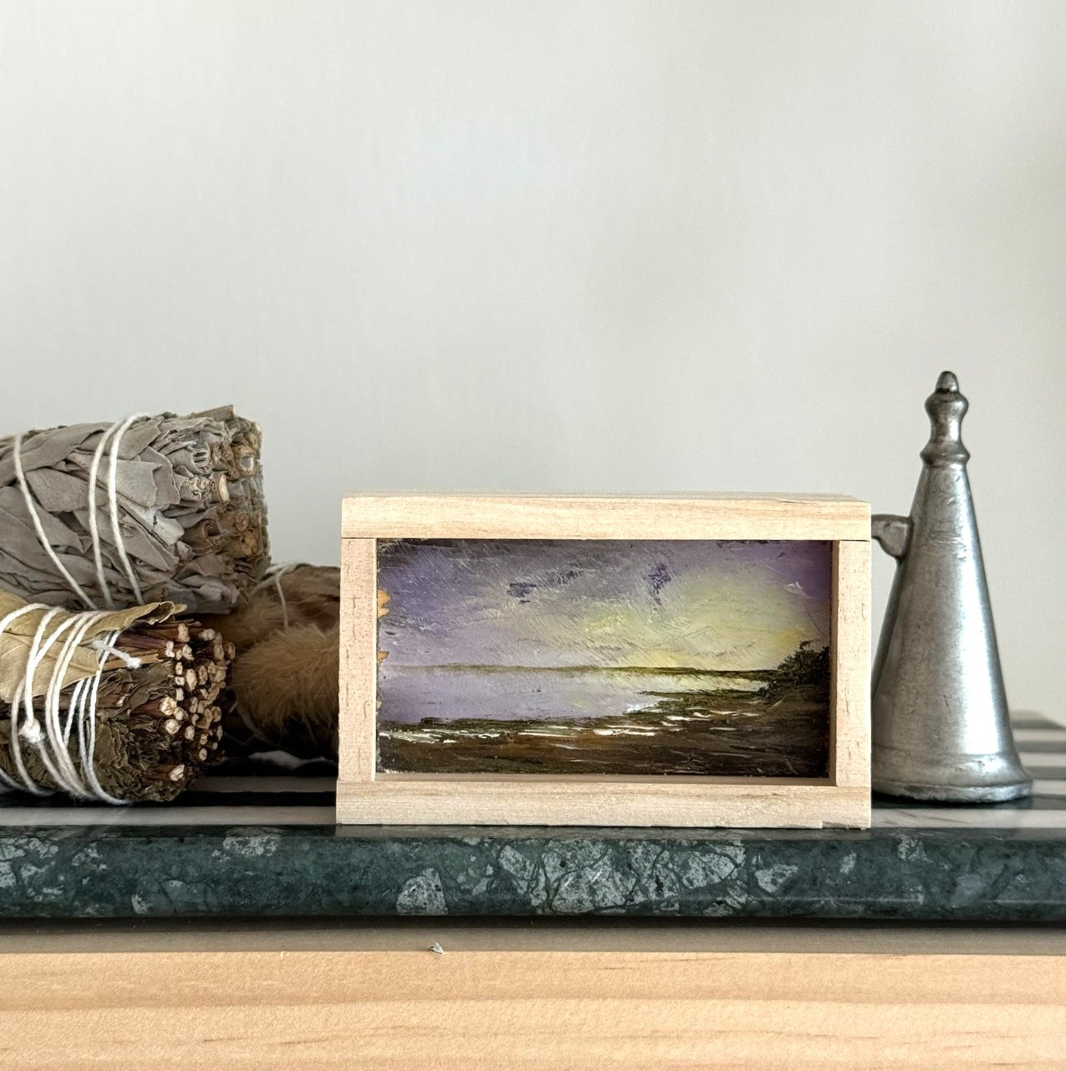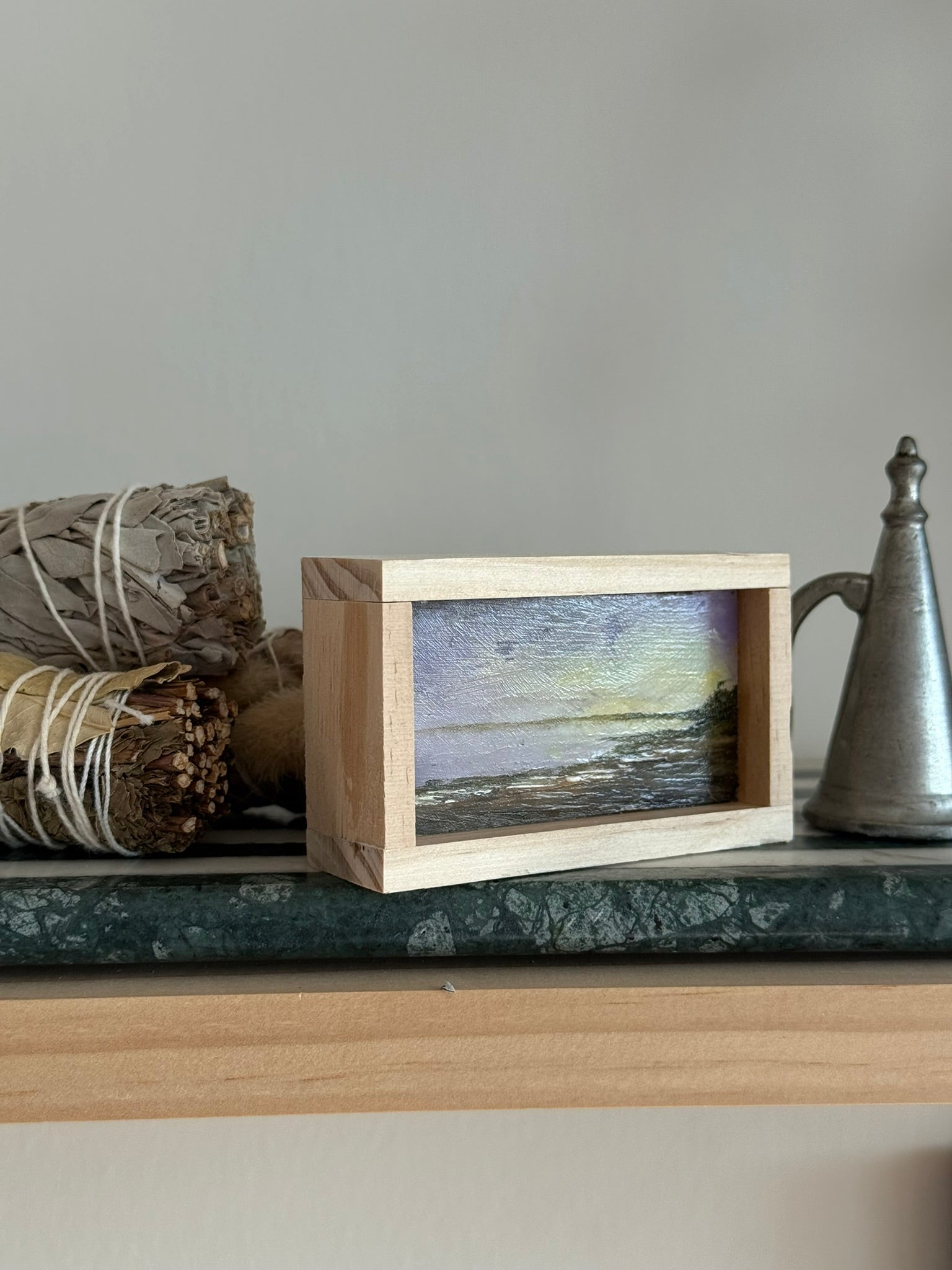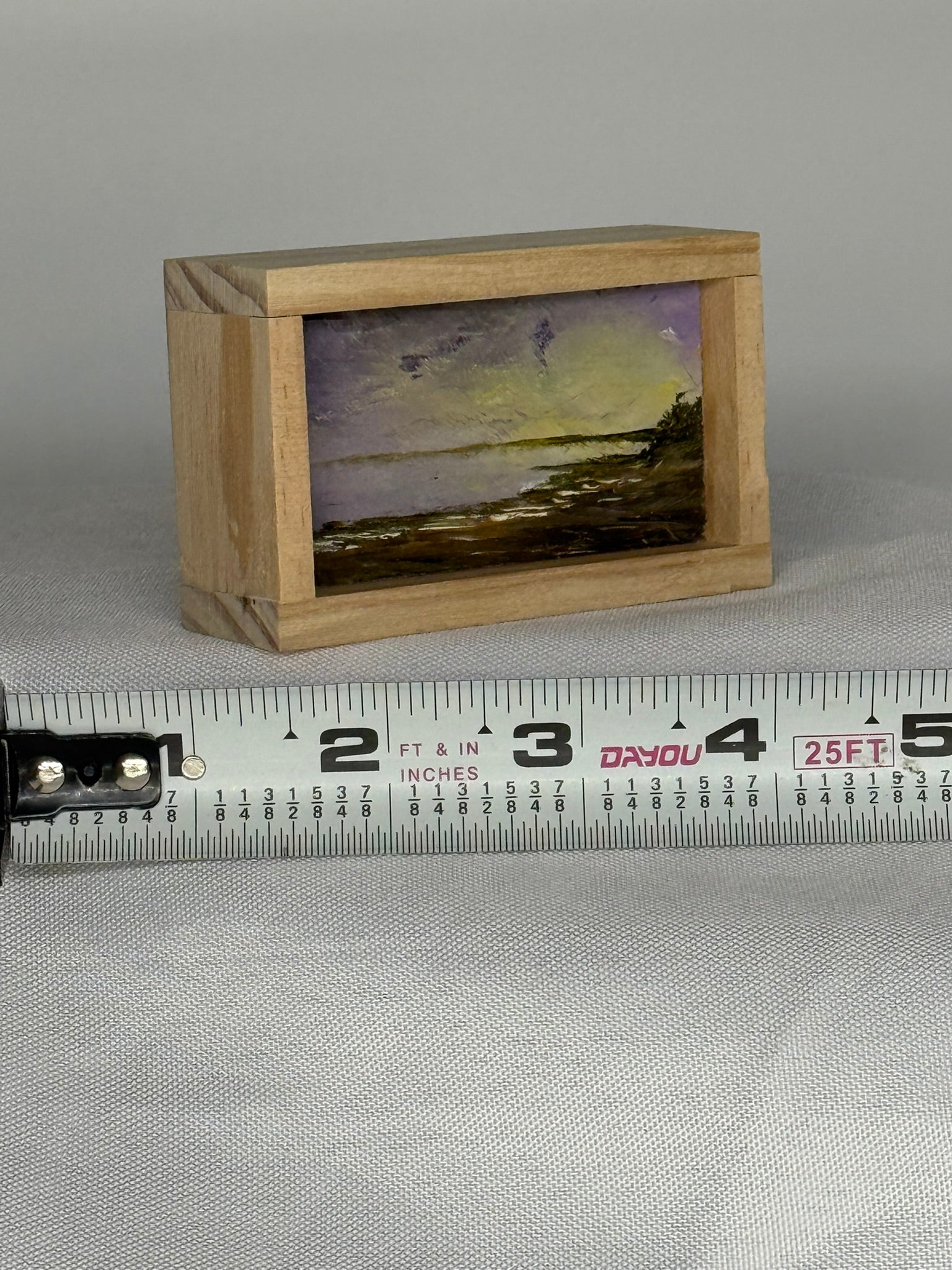 Mini Wood Block Painting #59. Oil on reclaimed wood. Framed in recycled framing material. Sizes range from 2” to 4” with and over all height of 1”. If there is a specific location you would like, please feel free to email me and I can show what I have.