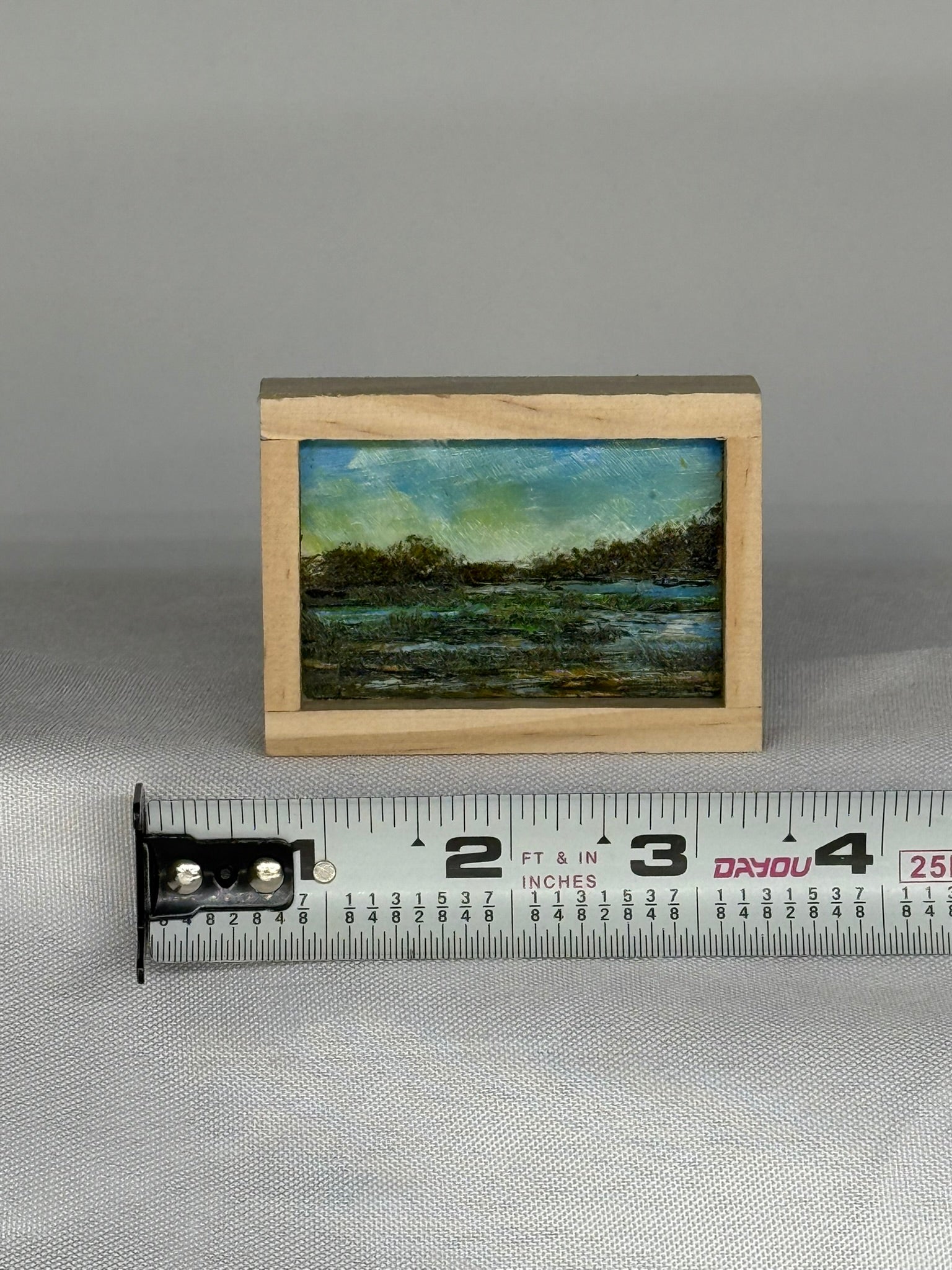 Mini Wood Block Painting #62. Oil on reclaimed wood. Framed in recycled framing material. Sizes range from 2” to 4” with and over all height of 1”. If there is a specific location you would like, please feel free to email me and I can show what I have.