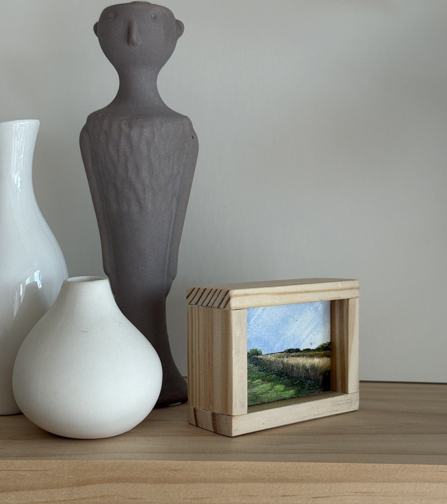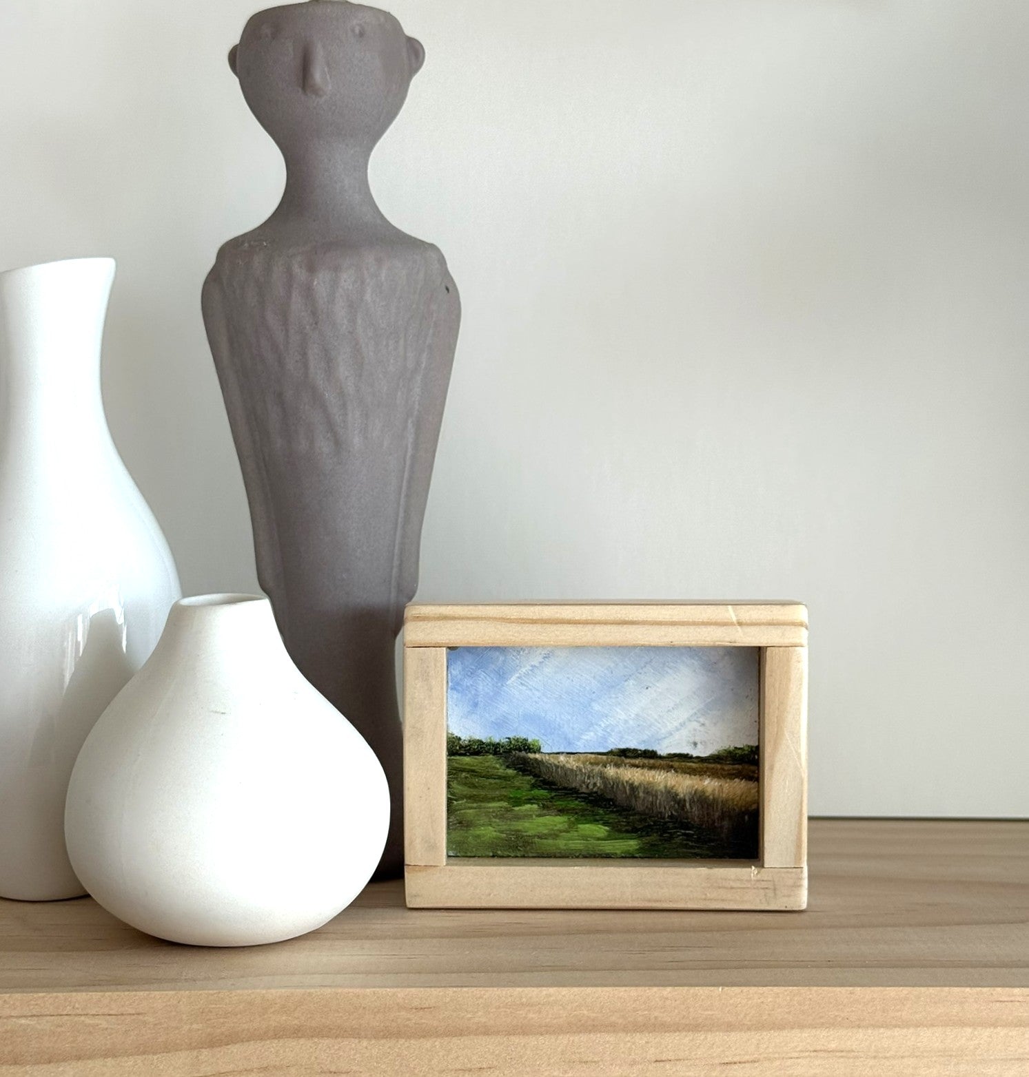 Mini Wood Block Painting #64. Oil on reclaimed wood. Framed in recycled framing material. Sizes range from 2” to 4” with and over all height of 1”. If there is a specific location you would like, please feel free to email me and I can show what I have.