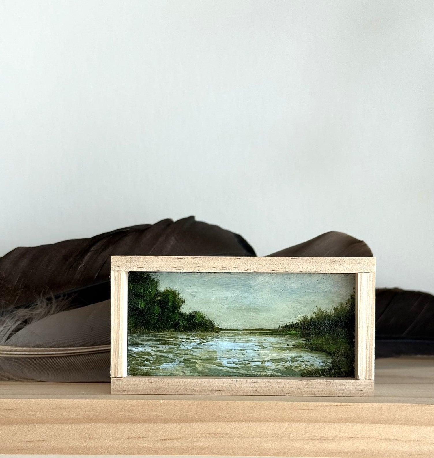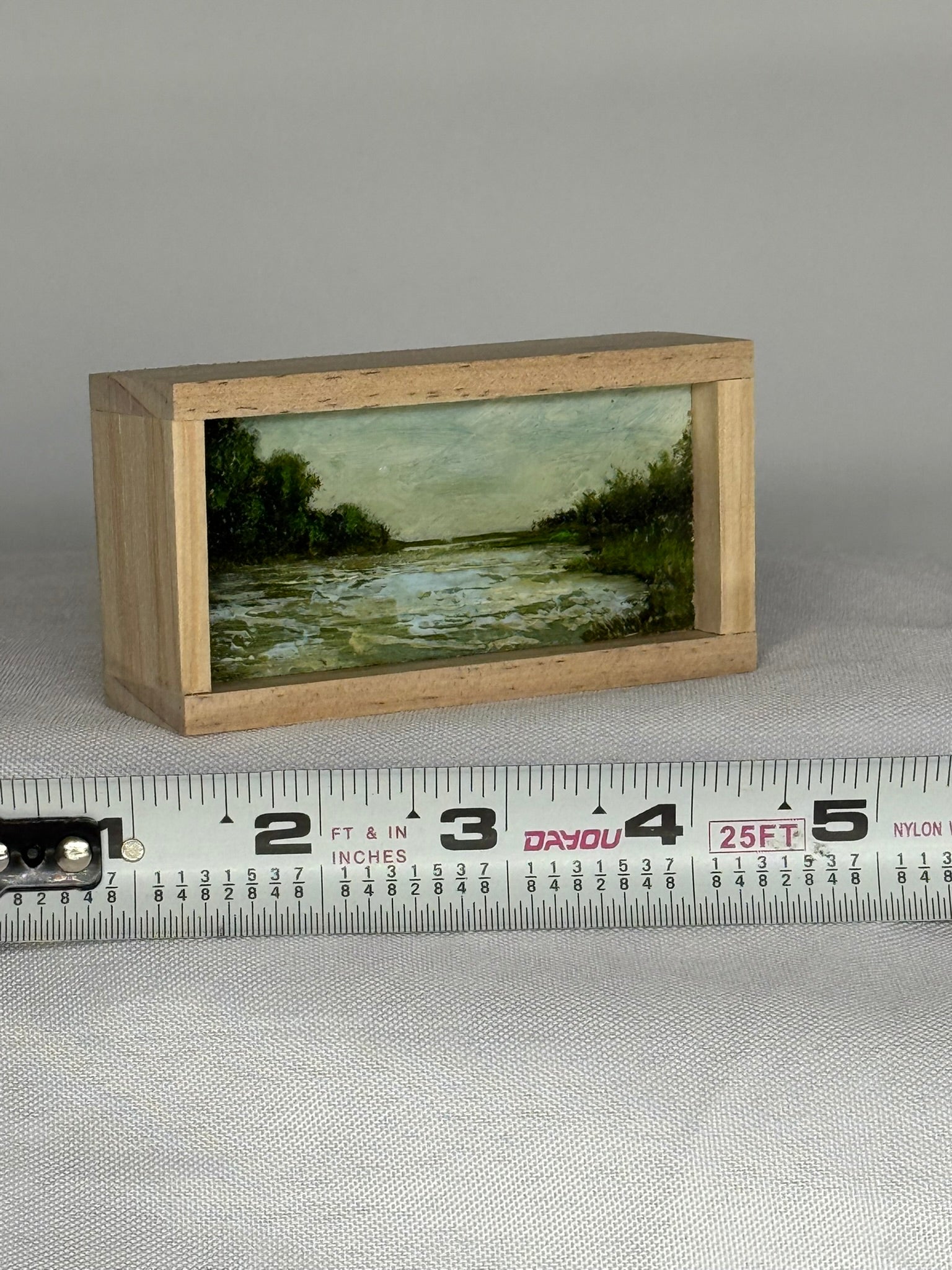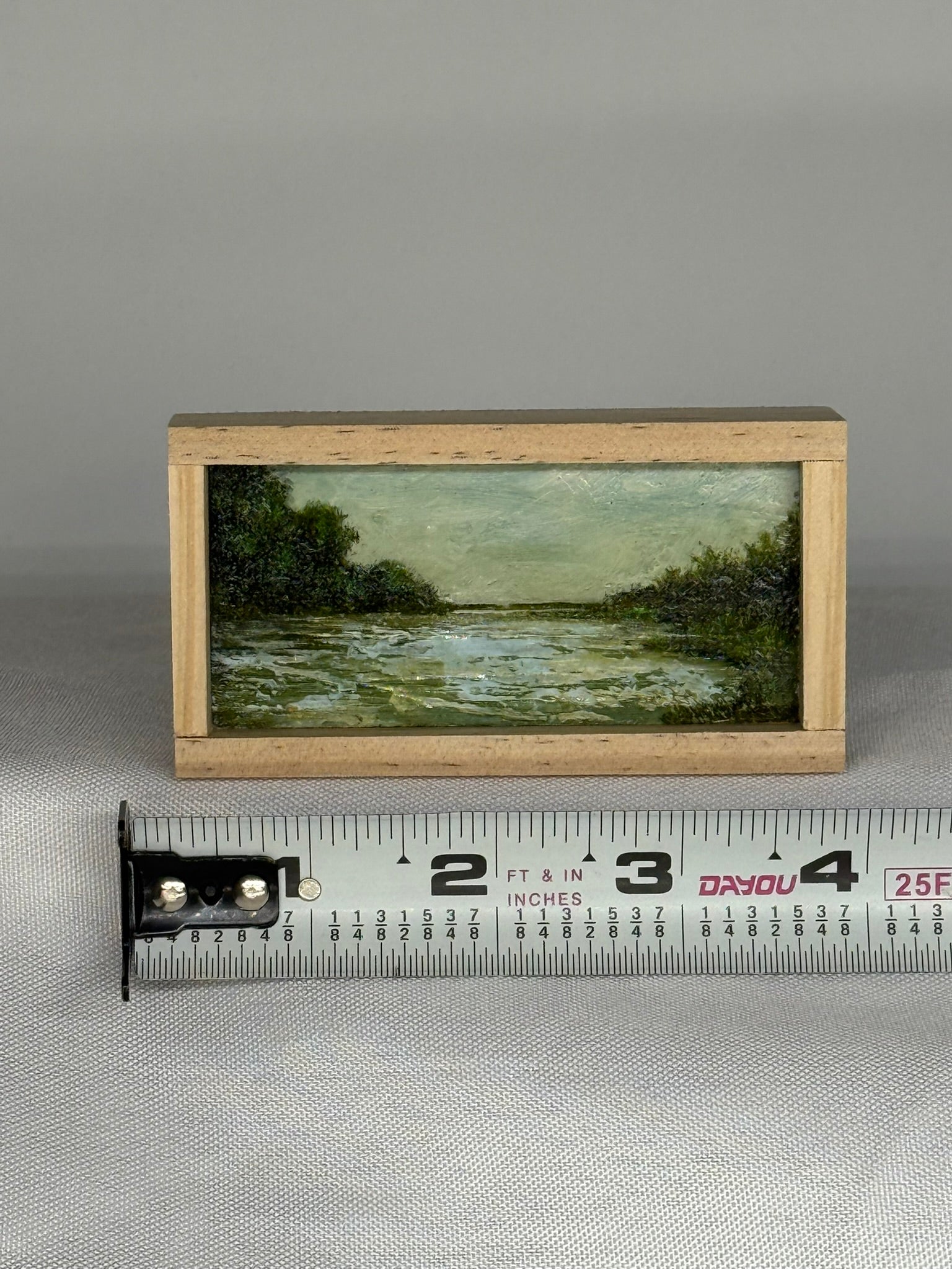 Mini Wood Block Painting #72. Oil on reclaimed wood. Framed in recycled framing material. Sizes range from 2” to 4” with and over all height of 1”. If there is a specific location you would like, please feel free to email me and I can show what I have.