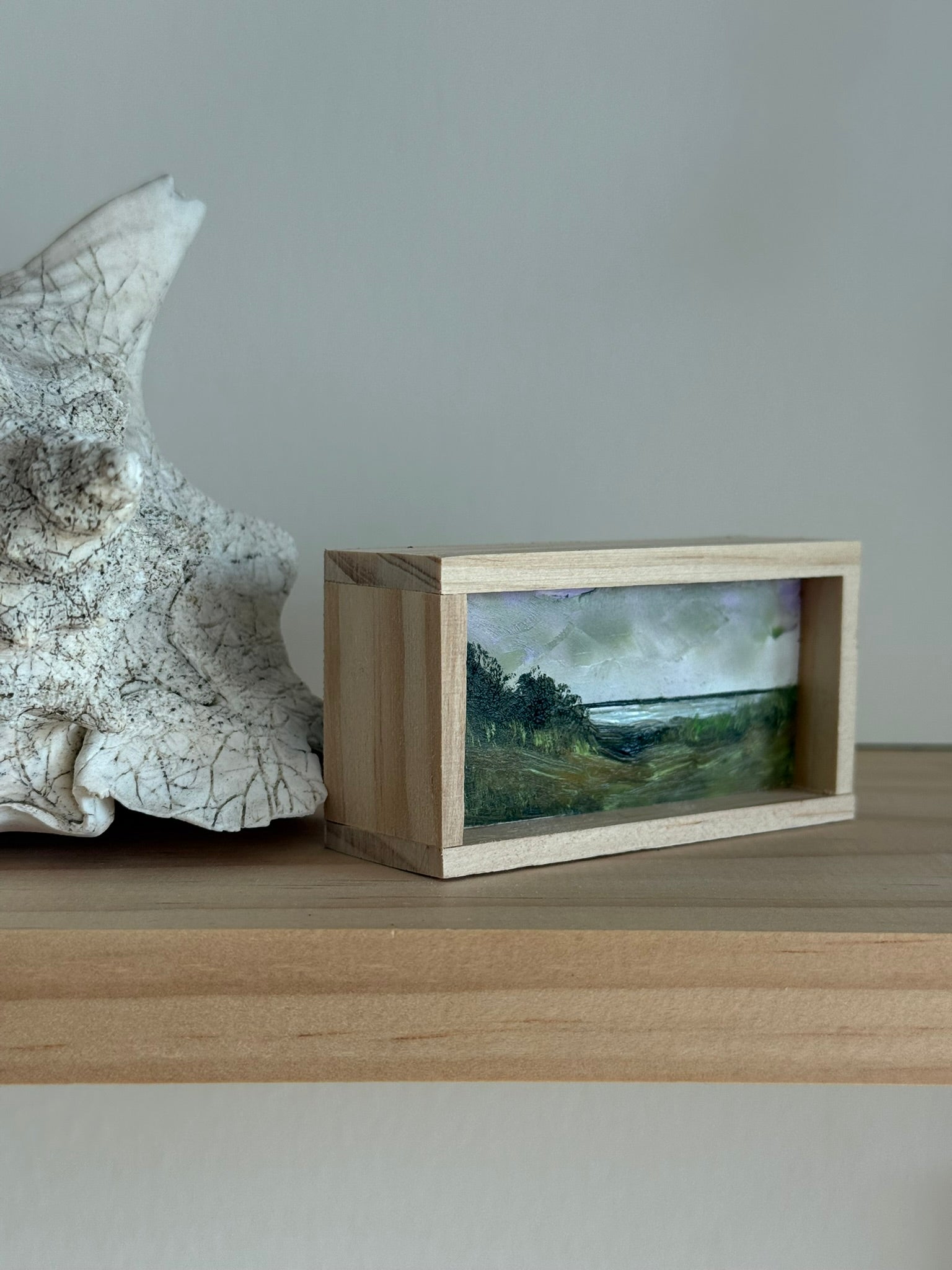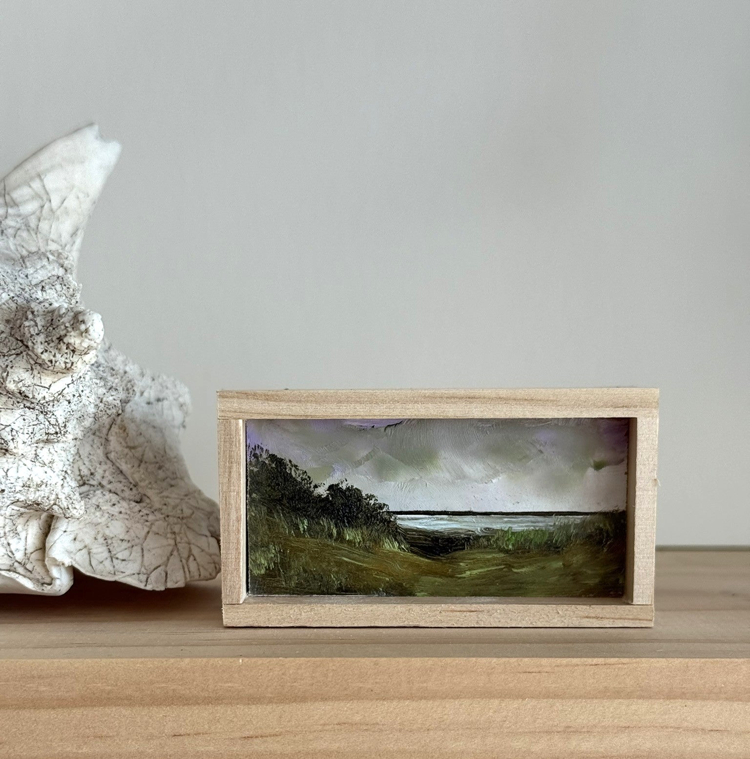 Mini Wood Block Painting #73. Oil on reclaimed wood. Framed in recycled framing material. Sizes range from 2” to 4” with and over all height of 1”. If there is a specific location you would like, please feel free to email me and I can show what I have.