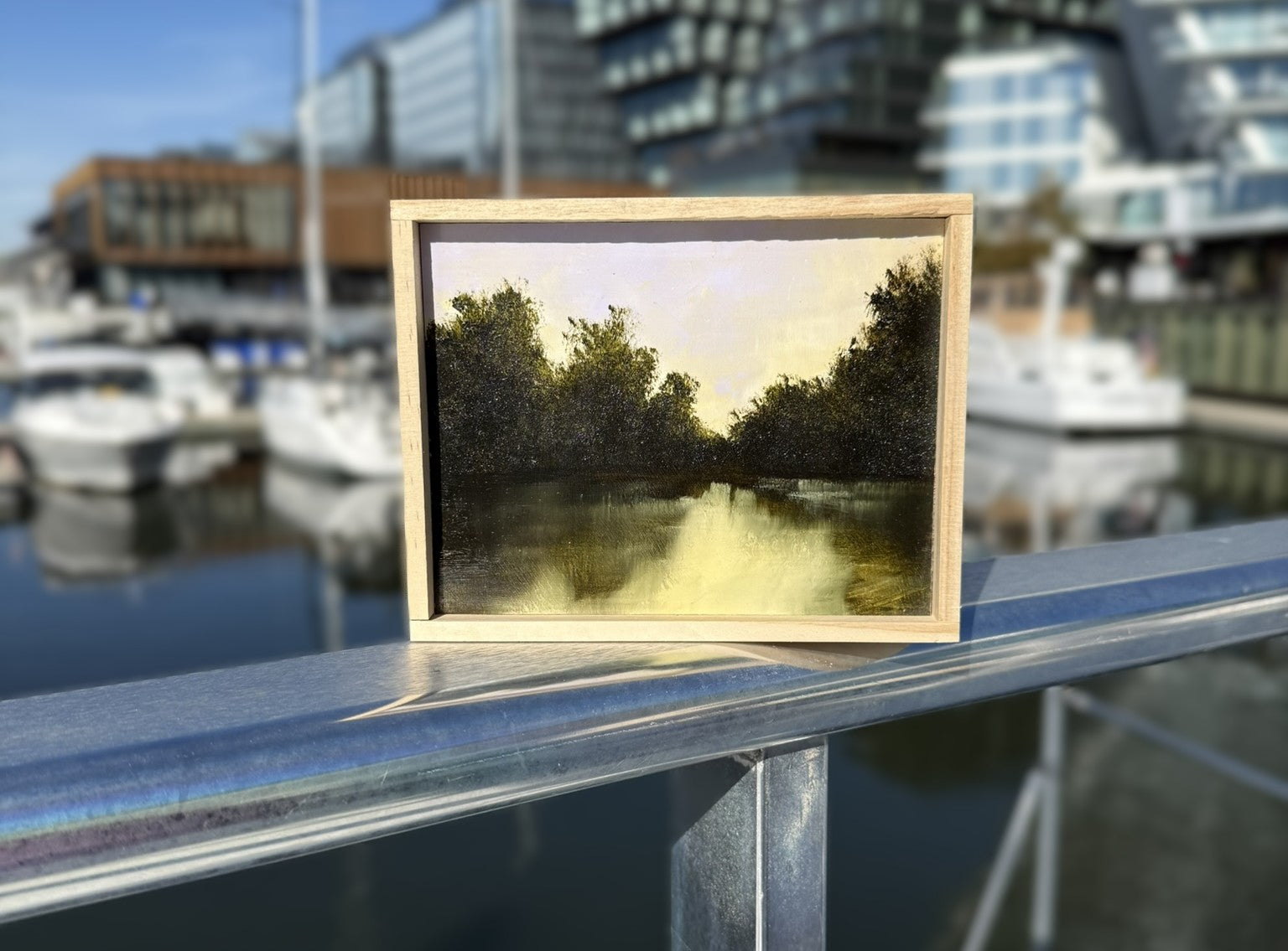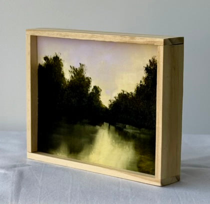 Study. Titled: Reflecting Light. Oil on Reclaimed Board and Framed in recycled lattice slats. Painted in the Autumn of 2025. Measurements: 5.5" Long x 4.5" High x 1" Deep. Location: Georgica Pond, Easthampton. Long Island New York.