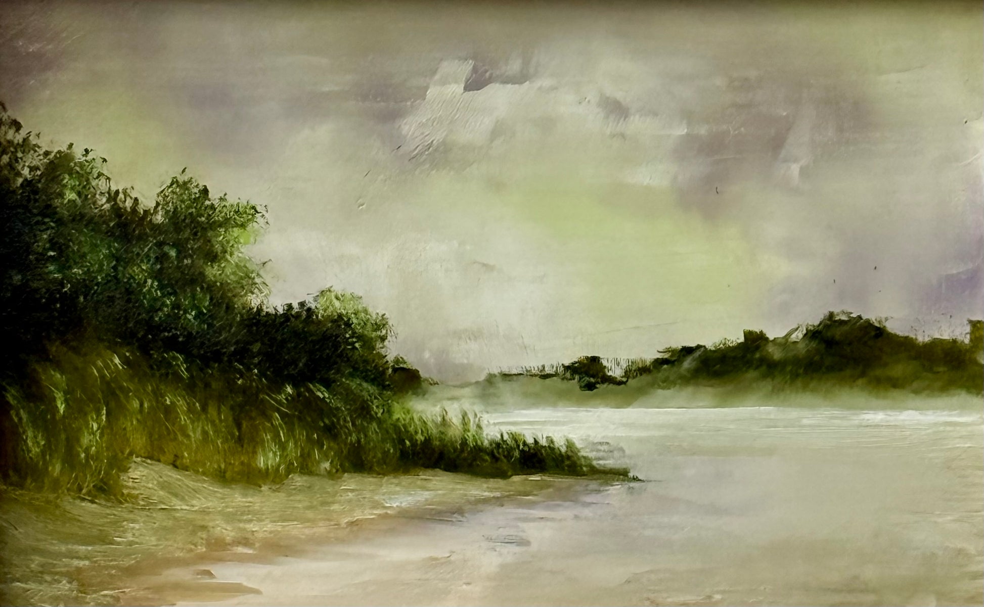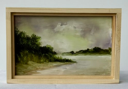 Title: Study in Pink, Green and White. Oil on Reclaimed Board and Framed in recycled lattice slats. Painted in the Autumn of 2025. Measurements: 8" Long x 5.5" High x 1" Deep. Location: Potomac River at Hain's Point. Southwest Washington DC.